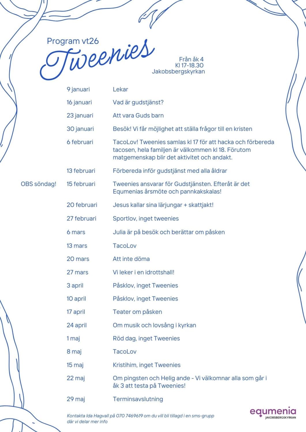 Terminsstart för vårterminen är 16 januari och vi ses ungefär varannan vecka. Hela programmet finns ovan. Välkommen du som går i årskurs 7 eller uppåt, oavsett om du aldrig varit i kyrkan innan eller om du är här hela tiden! Om du har några frågor är du välkommen att höra av dig till ungdomsledare Ida Hagvall på 070 7469619 eller mail [email protected]